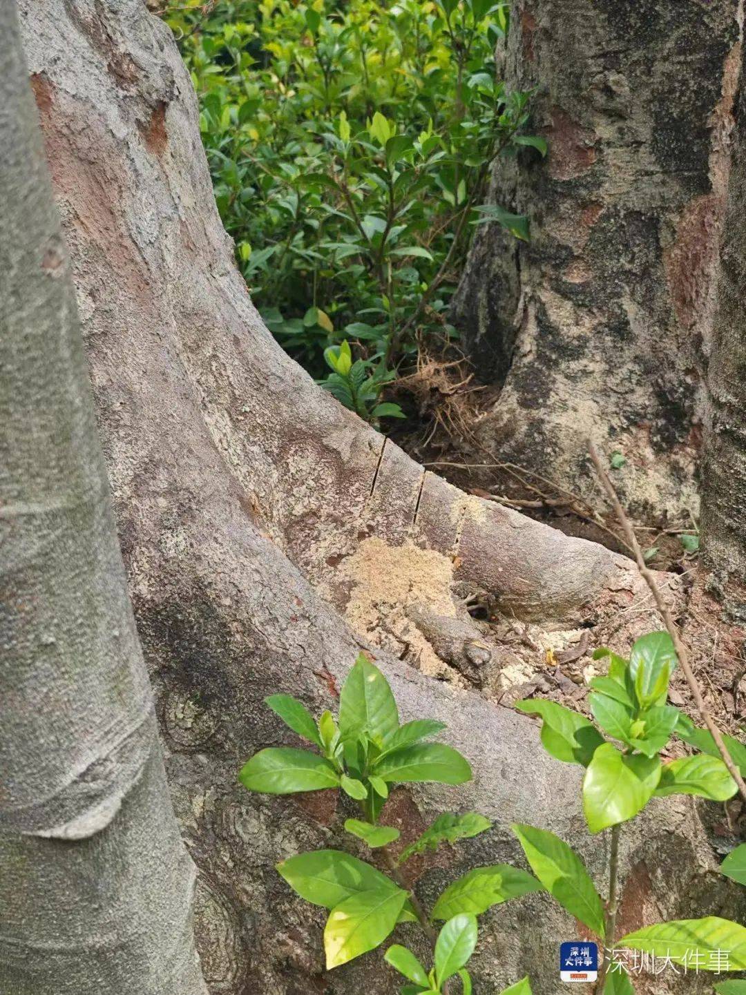 5月11日上午,宝安区西乡街道西湾公园管理处工作人员在工作中巡查发现,游客符某持锯子破坏公园内一棵天料木,没一会工夫,树干就被锯了三道锯痕。